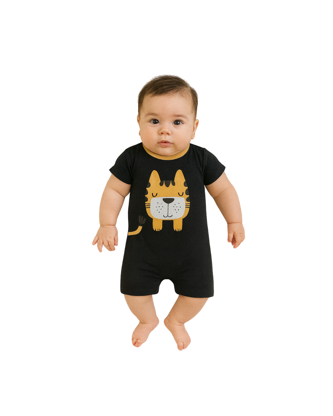 Fresco, cómodo y con todo el estilo para este verano. 🌞 Este enterito negro de algodón es perfecto para los días de calor, con manga corta y short para que tu bebé esté siempre fresquito. Tiene broches en el hombro y entrepierna para hacer la muda más fácil y rápida. Además, su diseño con un tierno tigre en el centro le da un toque salvajemente adorable. 🖤🐯